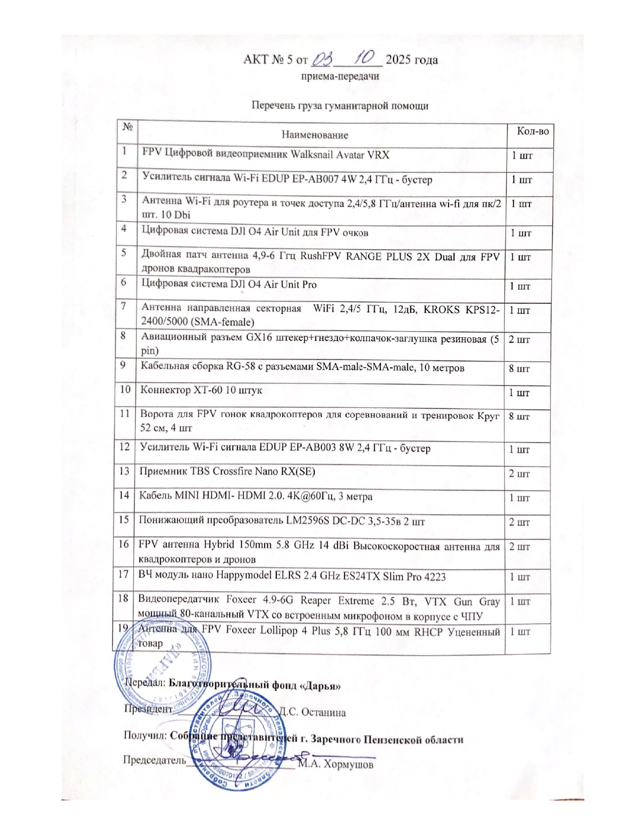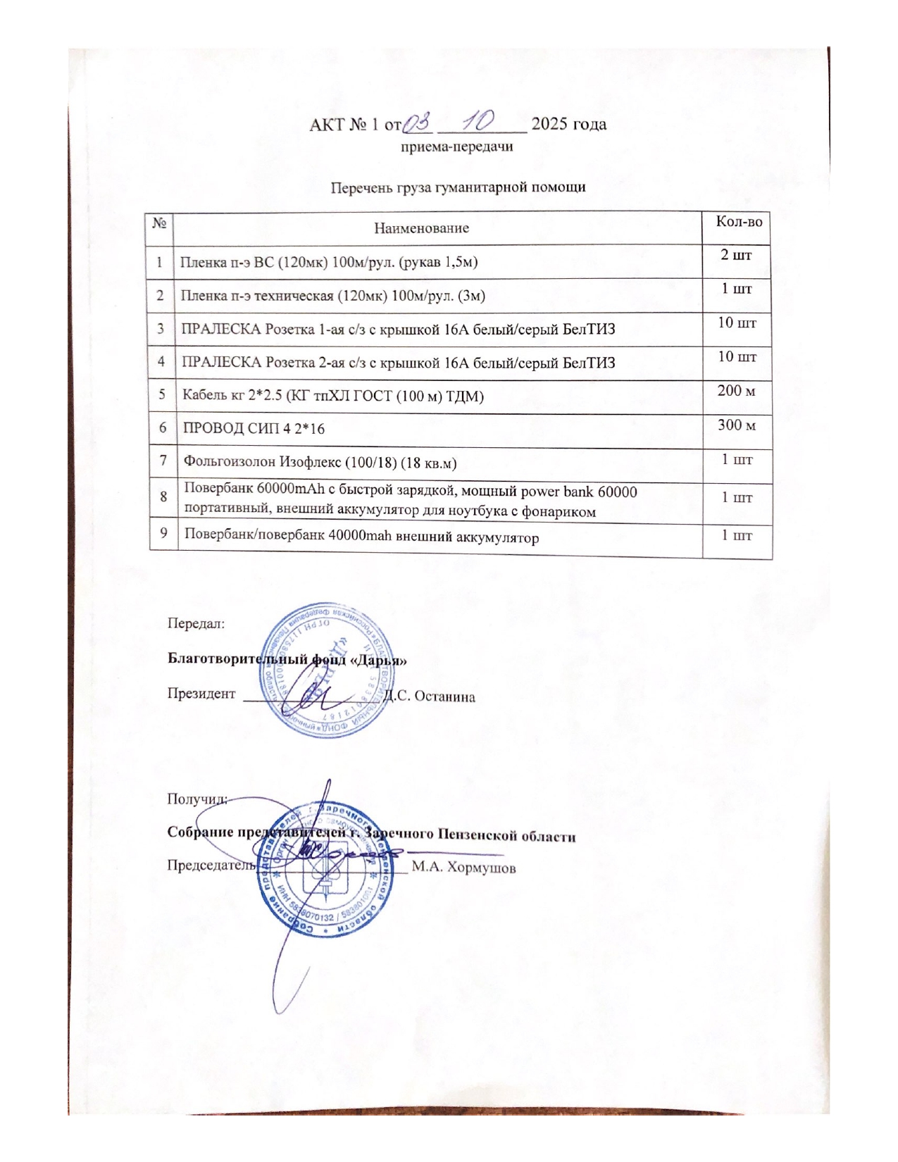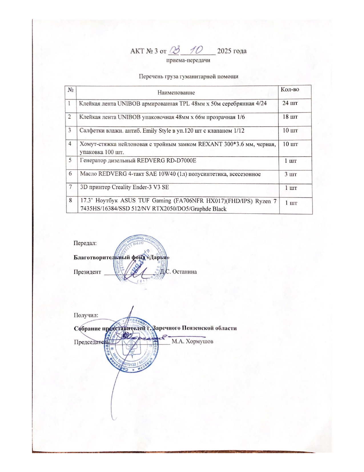 В ходе благотворительных мероприятий, направленных на оказание помощи бойцам СВО, в Заречном по программе «За жизнь! За Родину!» (ранее освещавшимся на сайте) было собрано более 800 тыс рублей. На данный момент по запросу Совета представителей было закуплено оборудование на 357 052.8 рублей. В прилагаемых документах список закупленного оборудования.