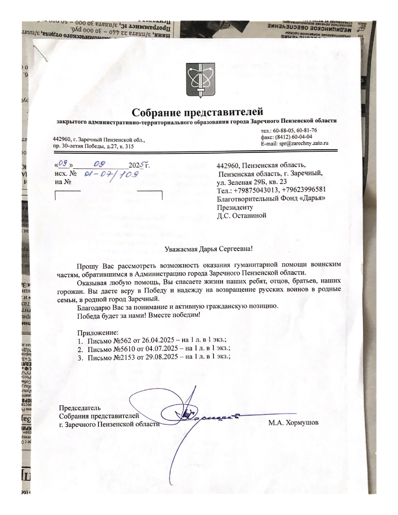 В ходе благотворительных мероприятий, направленных на оказание помощи бойцам СВО, в Заречном по программе «За жизнь! За Родину!» (ранее освещавшимся на сайте) было собрано более 800 тыс рублей. На данный момент по запросу Совета представителей было закуплено оборудование на 357 052.8 рублей. В прилагаемых документах список закупленного оборудования.