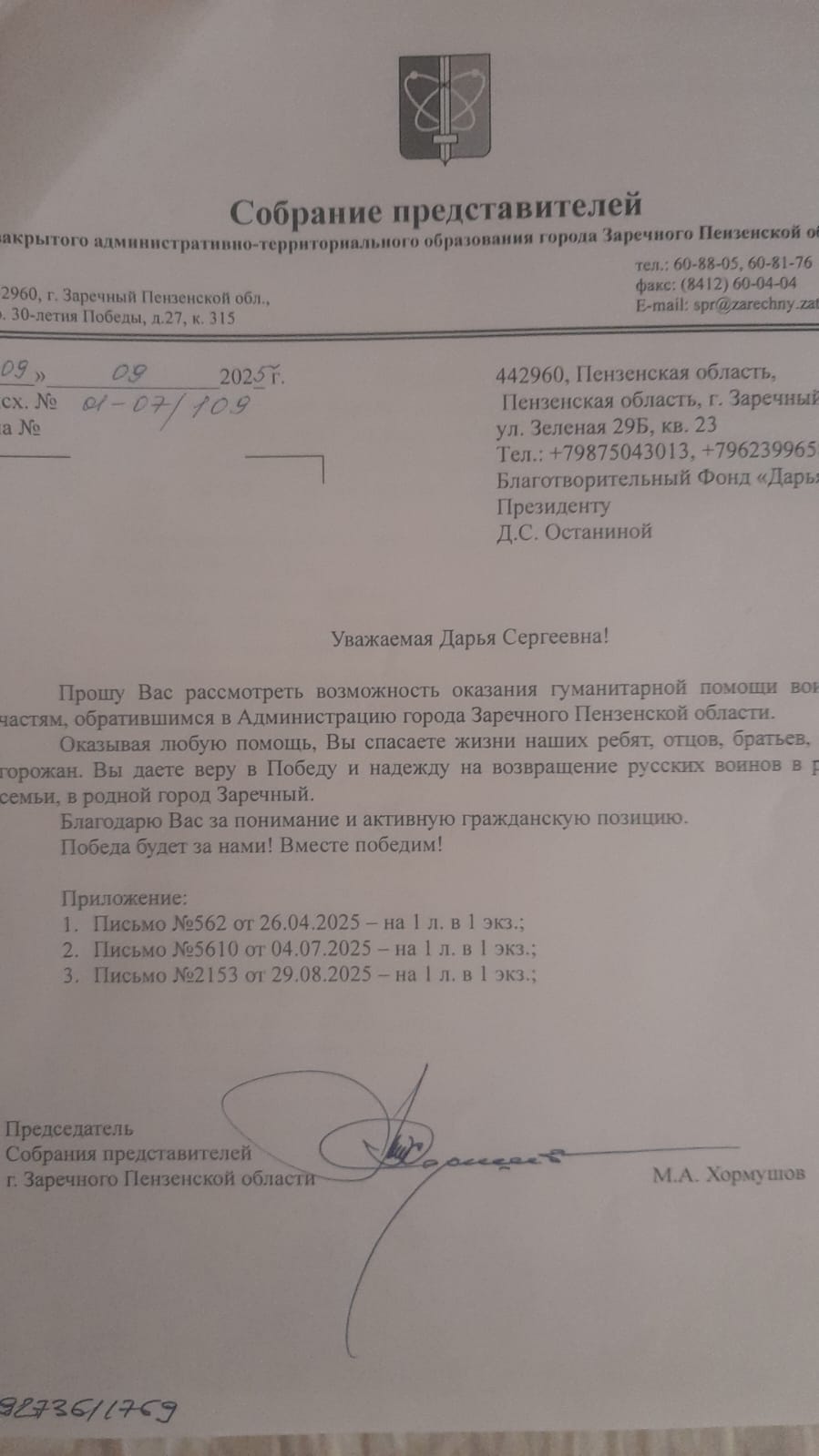 В ходе благотворительного концерта, который прошел в ДК "Современник" в конце августа и который был направлен на поддержку бойцов СВО, как мы уже сообщали, было собрано 800100 рублей. Из этих средств на данный момент на 357052,8 руб закуплено и направлено оборудование в три части, в которых служат наши зареченские парни, обратившиеся к главе города Заречного за помощью. Представители совета администрации отправились в командировку по трем частям, чтобы доставить закупленное оборудование. По возвращении также при поддержке БФ "Дарья" будет произведена закупка технических средств и товаров, которые были указаны в письмах-обращениях других частей.
